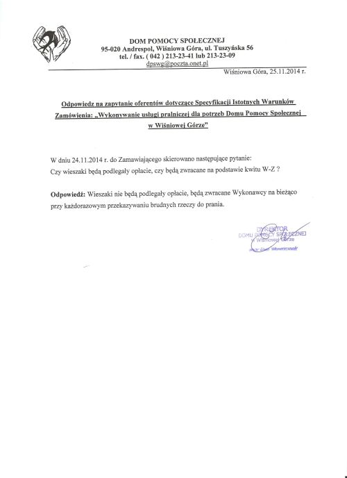 Wykonywanie usługi pralniczej dla potrzeb Domu Pomocy Społecznej w Wiśniowej Górze